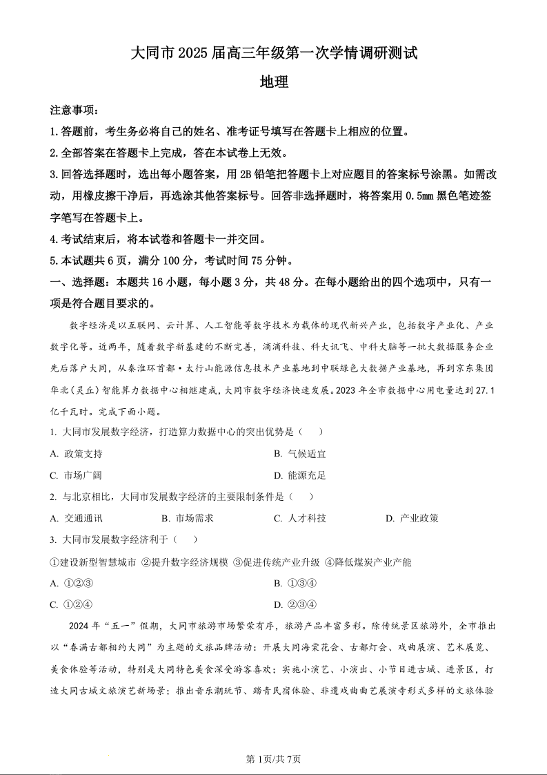 山西省大同市2025届高三年级第一次学情调研地理(原卷版)