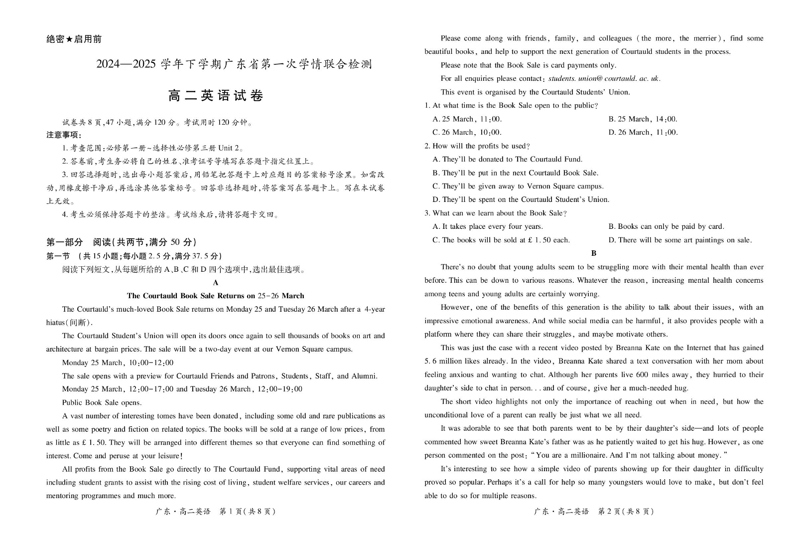 广东省部分校2024-2025学年高二下学期第一次学情联合检测英语