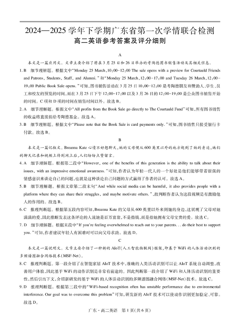 广东省部分校2024-2025学年高二下学期第一次学情联合检测英语答案