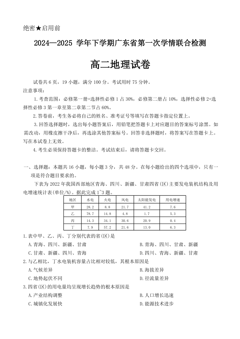 广东省部分校2024-2025学年高二下学期第一次学情联合检测地理