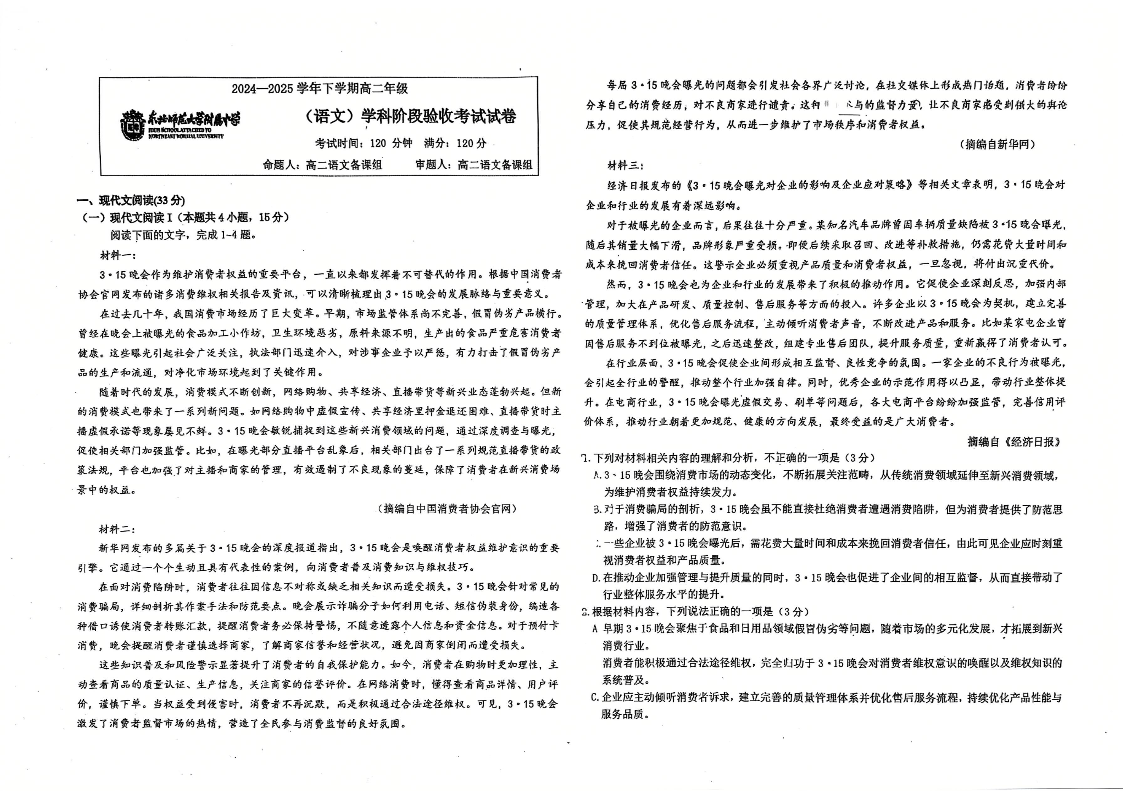 吉林省长春市东北师范大学附属中学2024-2025学年高二下学期3月月考试题语文