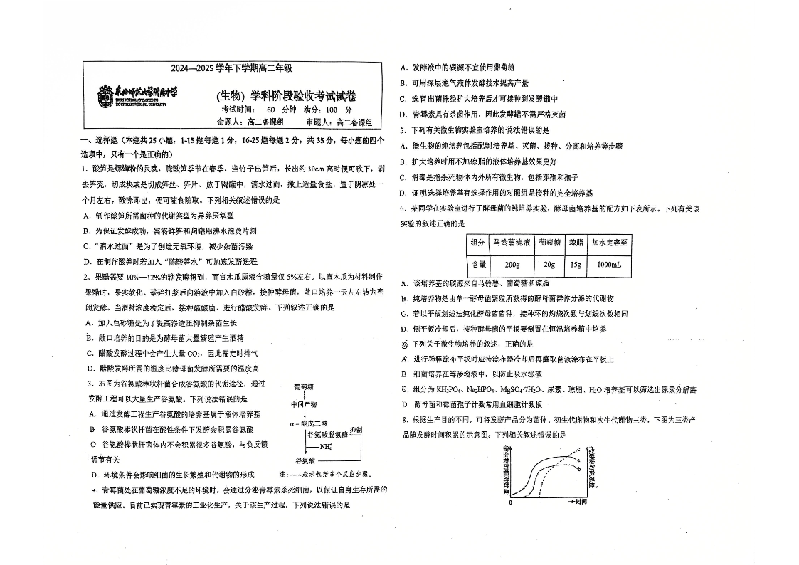 吉林省长春市东北师范大学附属中学2024-2025学年高二下学期3月月考试题生物