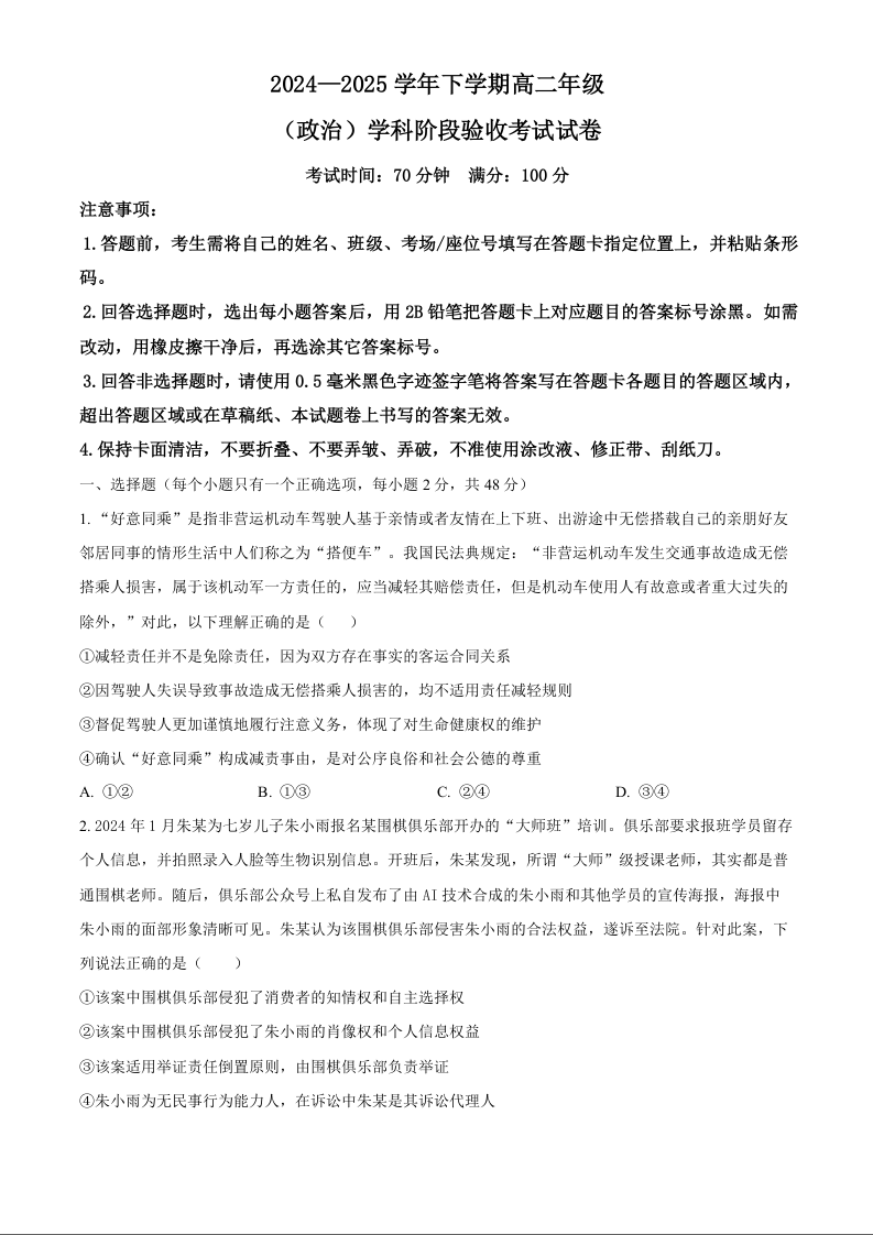 吉林省长春市东北师范大学附属中学2024-2025学年高二下学期3月月考试题政治(原卷版)