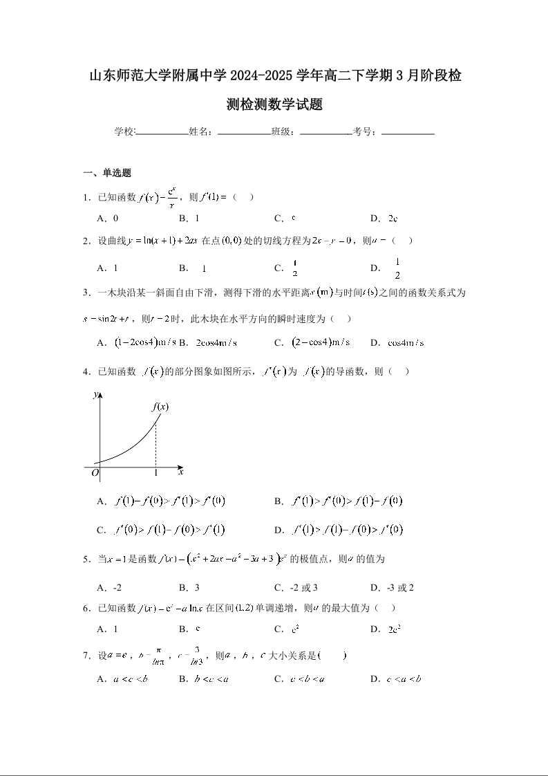 山东师范大学附属中学2024-2025学年高二下学期3月阶段检测试题数学+答案