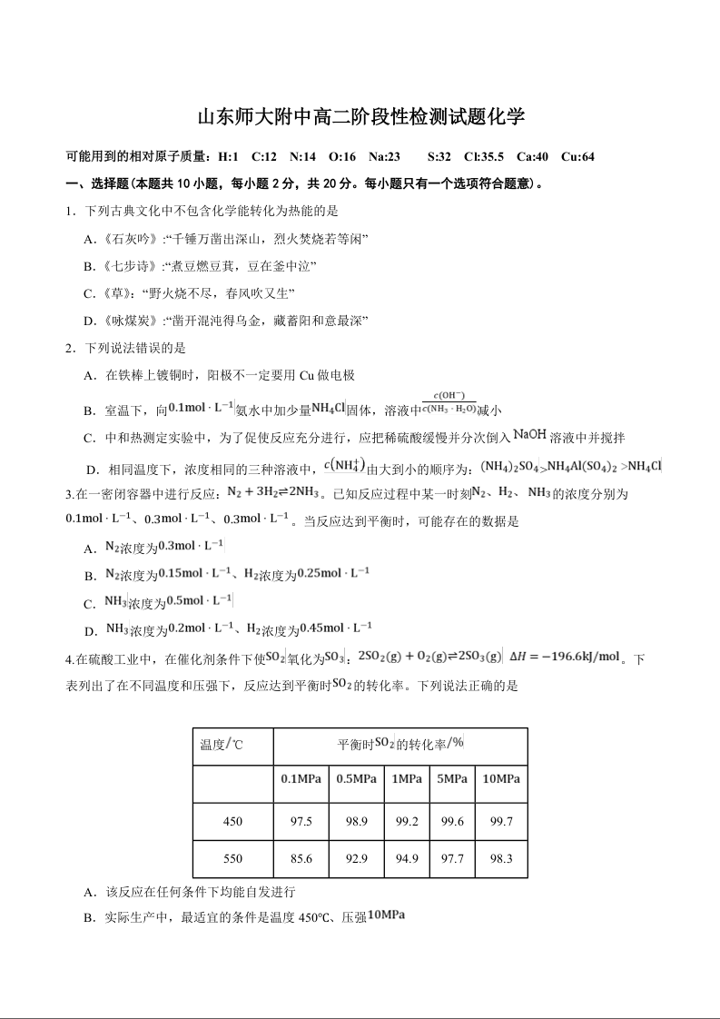山东师范大学附属中学2024-2025学年高二下学期3月阶段检测试题化学+答案