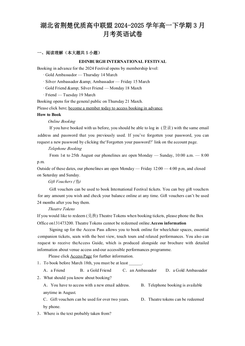 湖北省荆楚优质高中联盟2024-2025学年高一下学期3月月考英语+答案