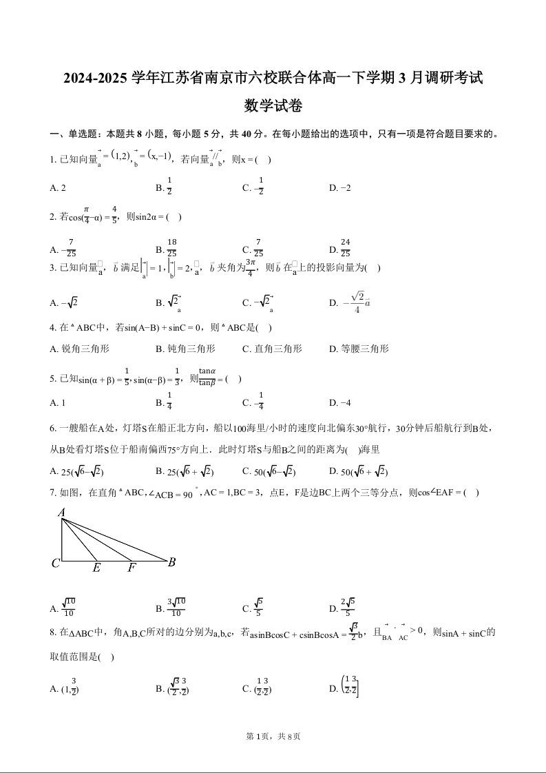 江苏省南京市六校联合体2024-2025学年高一下学期3月调研测试数学+答案