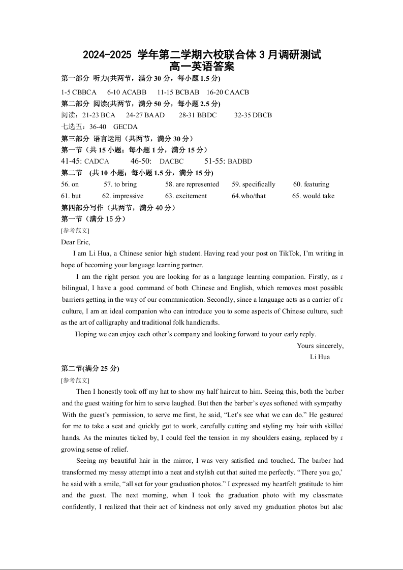 江苏省南京市六校联合体2024-2025学年高一下学期3月调研测试英语答案