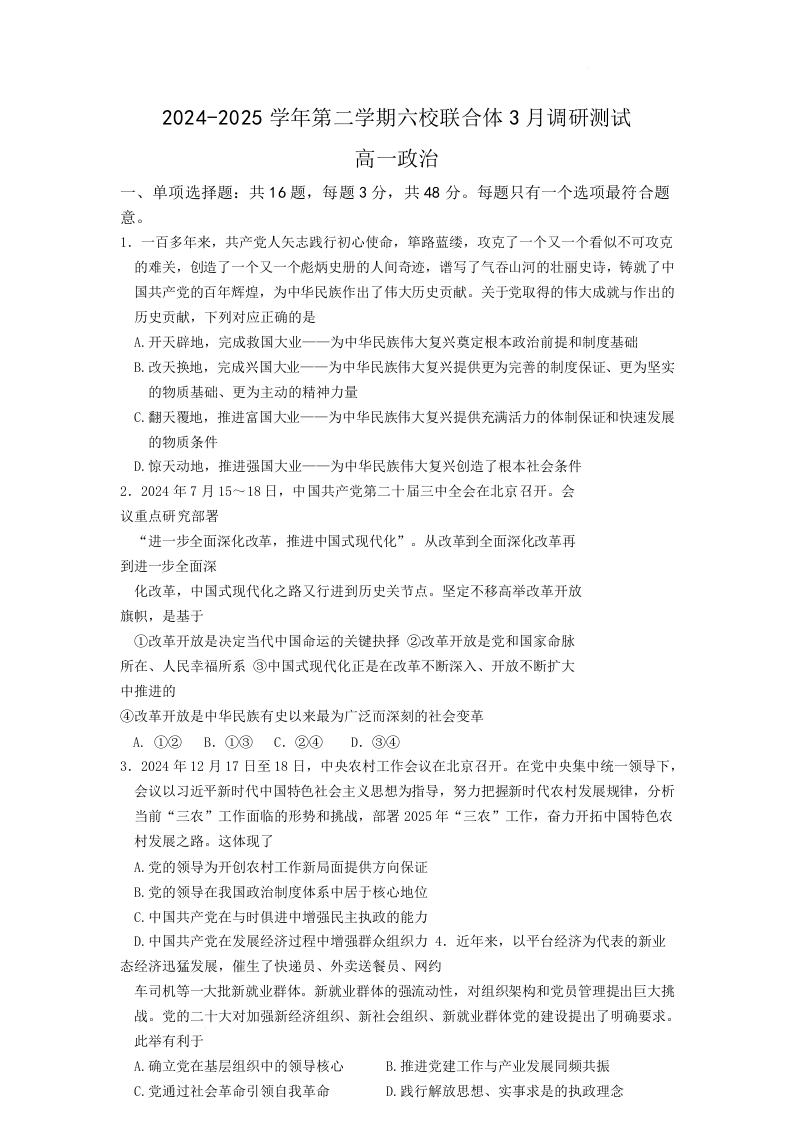 江苏省南京市六校联合体2024-2025学年高一下学期3月调研测试政治+答案
