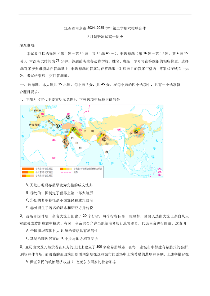 江苏省南京市六校联合体2024-2025学年高一下学期3月调研测试历史+答案