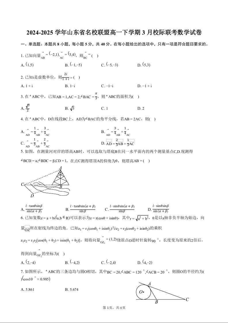 山东省名校联盟2024-2025学年高一下学期3月校际联考试题数学+答案