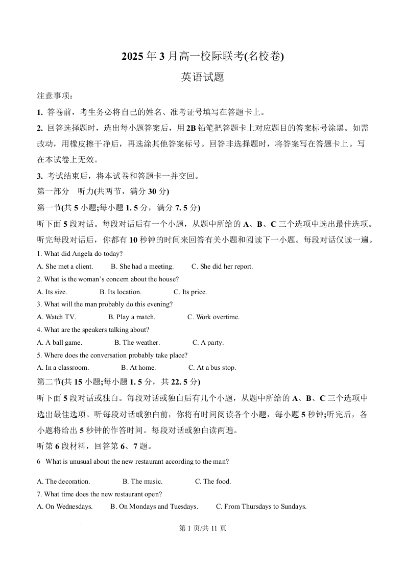 山东省名校联盟2024-2025学年高一下学期3月校际联考试题 英语+答案