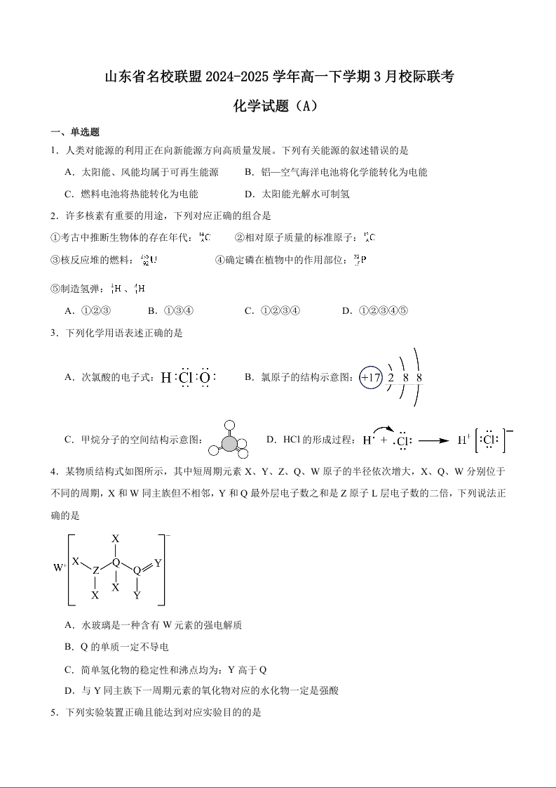 山东省名校联盟2024-2025学年高一下学期3月校际联考试题化学A+答案