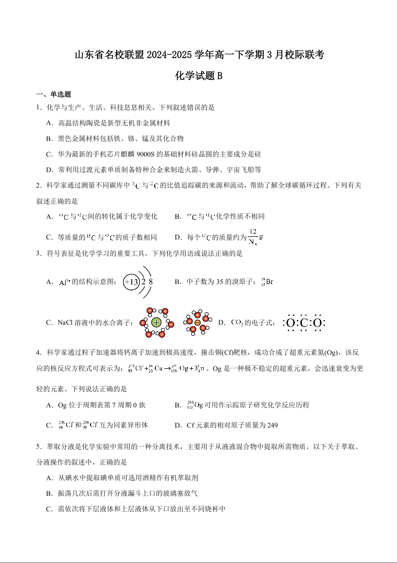 山东省名校联盟2024-2025学年高一下学期3月校际联考试题化学B+答案