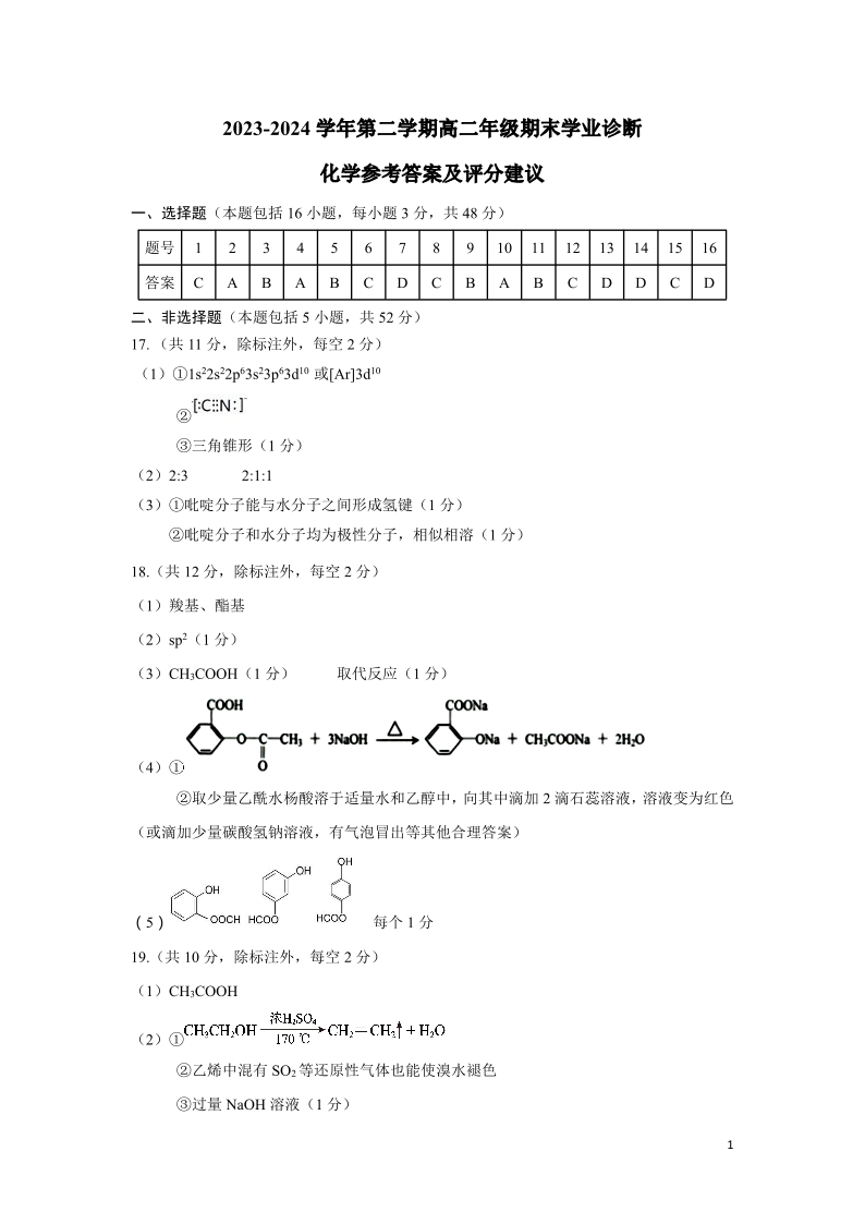 山西省太原市高2025届第二学期期末学业诊断化学答案