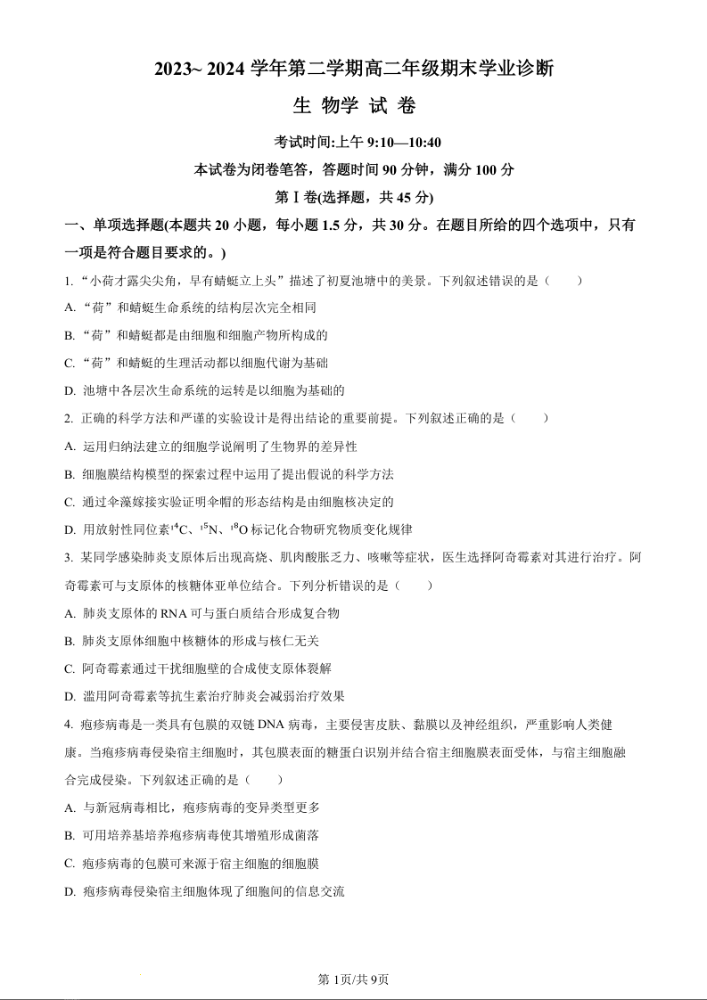 山西省太原市高2025届第二学期期末学业诊断生物(原卷版)