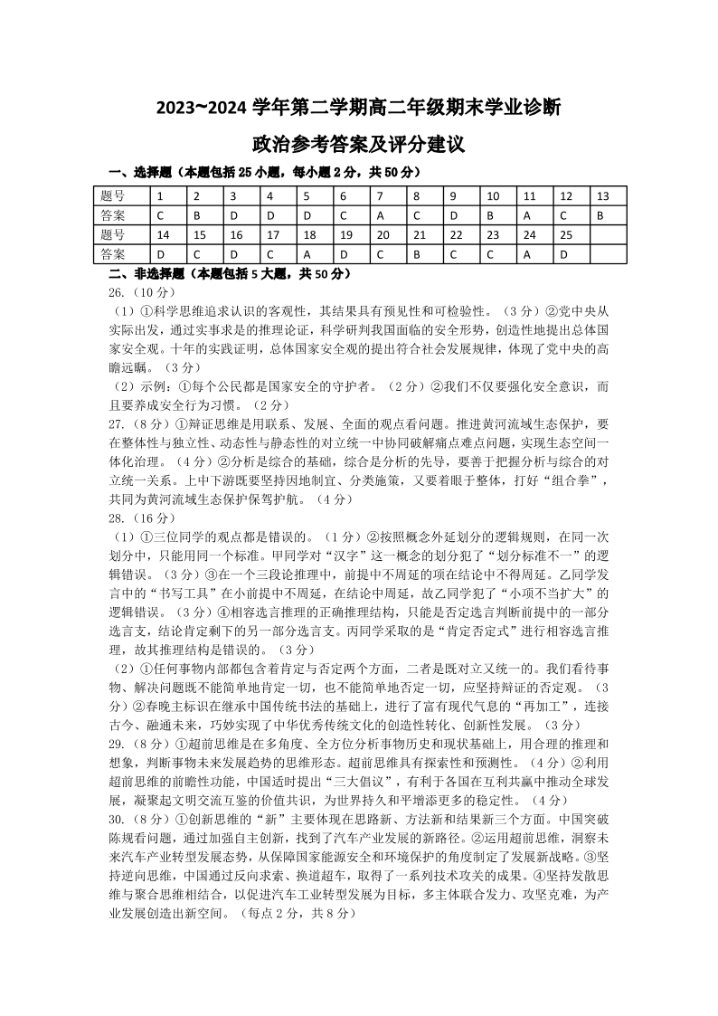 山西省太原市高2025届第二学期期末学业诊断政治答案