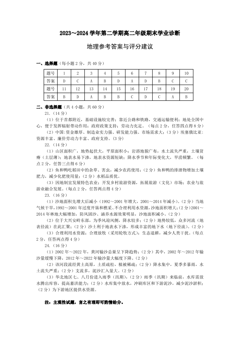 山西省太原市高2025届第二学期期末学业诊断地理答案