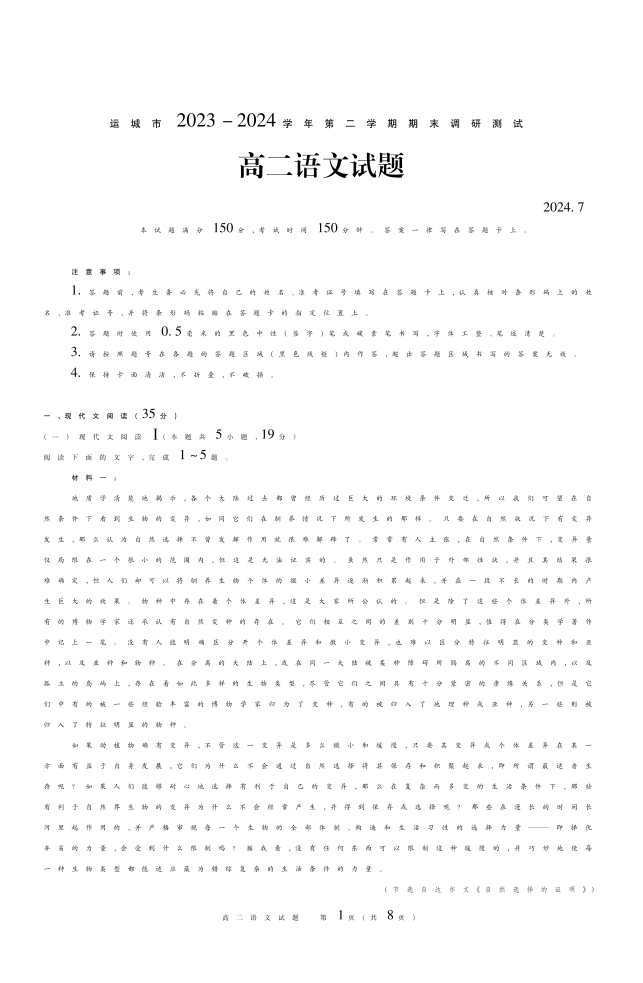 山西省运城市高2025届第二学期期末调研测试语文
