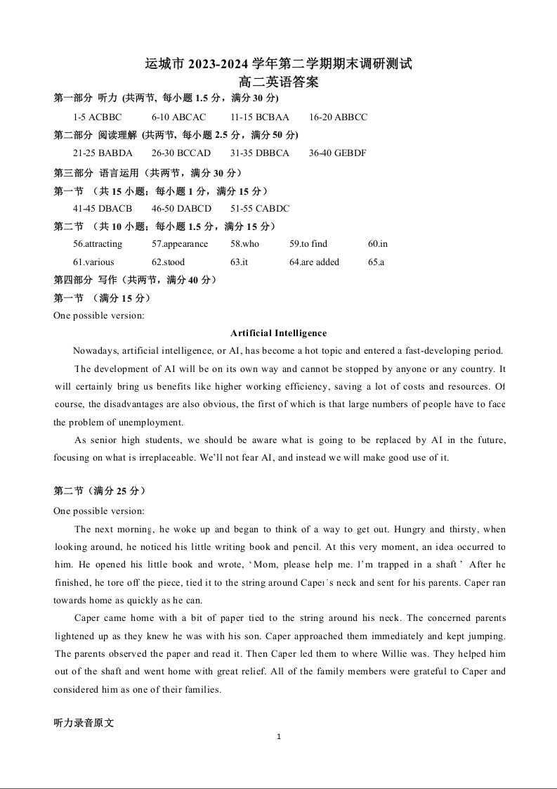 山西省运城市高2025届第二学期期末调研测试英语答案