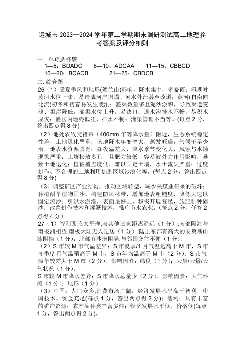 山西省运城市高2025届第二学期期末调研测试地理答案