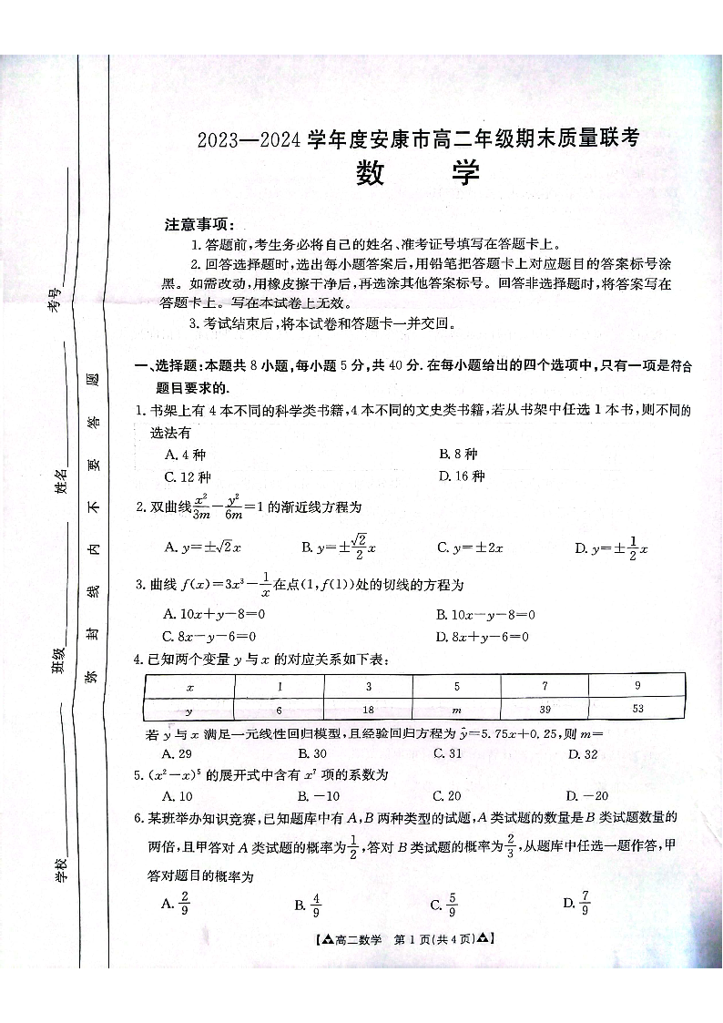 陕西省安康市2023-2024学年高二下学期6月期末质量联考数学