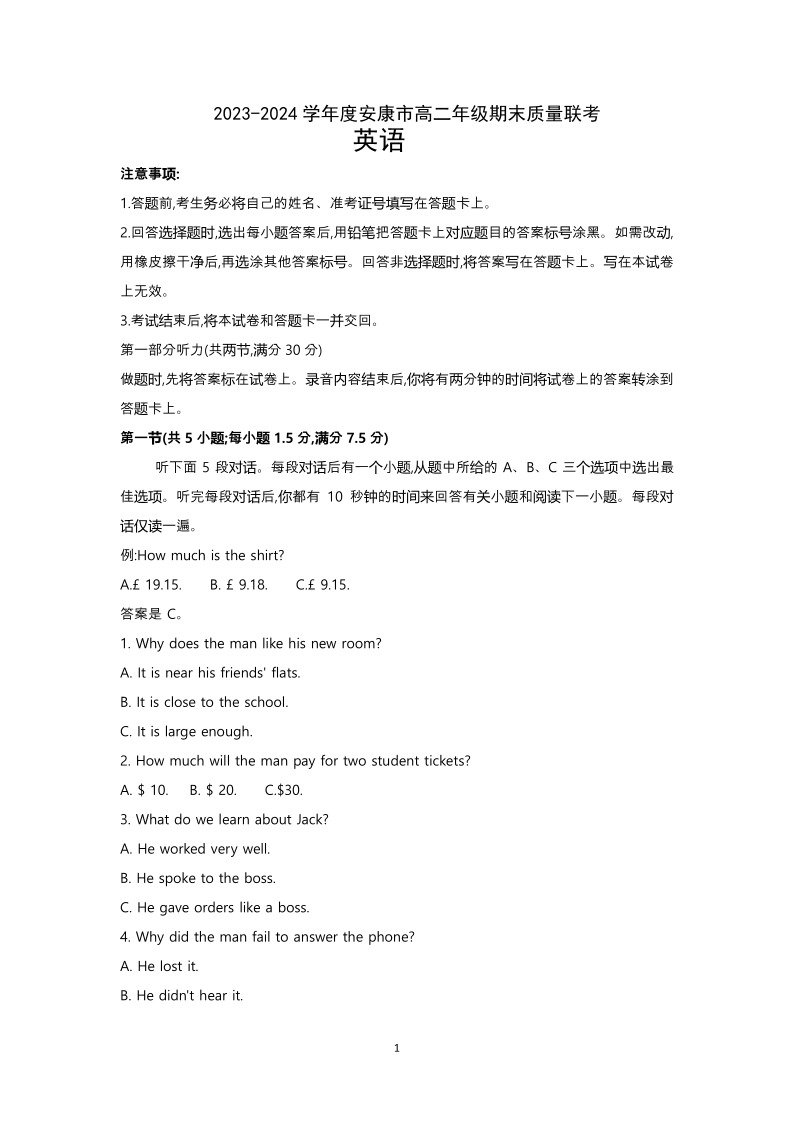 陕西省安康市2023-2024学年高二下学期6月期末质量联考英语