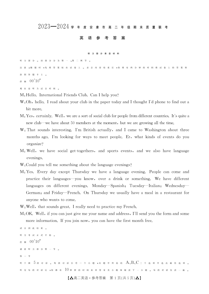 陕西省安康市2023-2024学年高二下学期6月期末质量联考英语答案