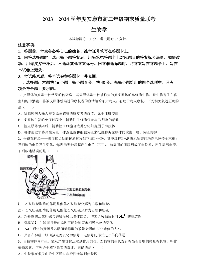 陕西省安康市2023-2024学年高二下学期6月期末质量联考生物