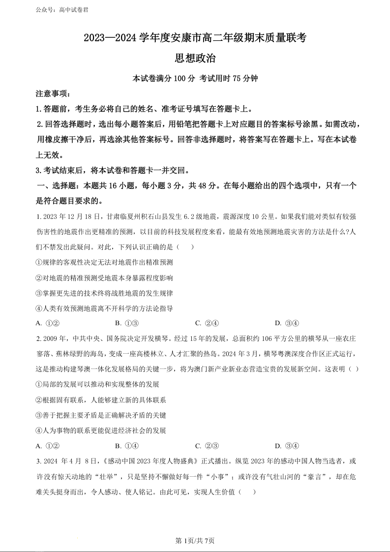 陕西省安康市2023-2024学年高二下学期6月期末质量联考政治(原卷版)