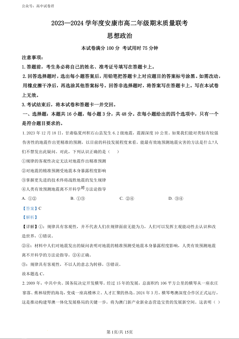 陕西省安康市2023-2024学年高二下学期6月期末质量联考政治(精品解析版)