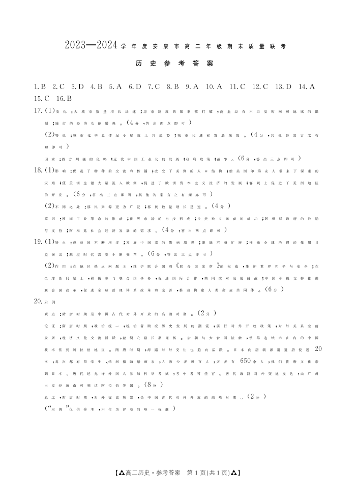 陕西省安康市2023-2024学年高二下学期6月期末质量联考历史答案