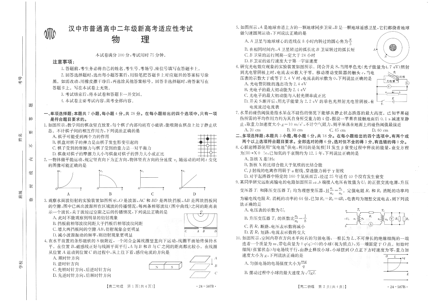陕西省汉中市高2025届下学期7月期末考试物理+答案
