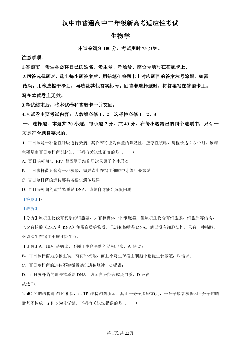 陕西省汉中市高2025届下学期7月期末考试生物(精品解析版)