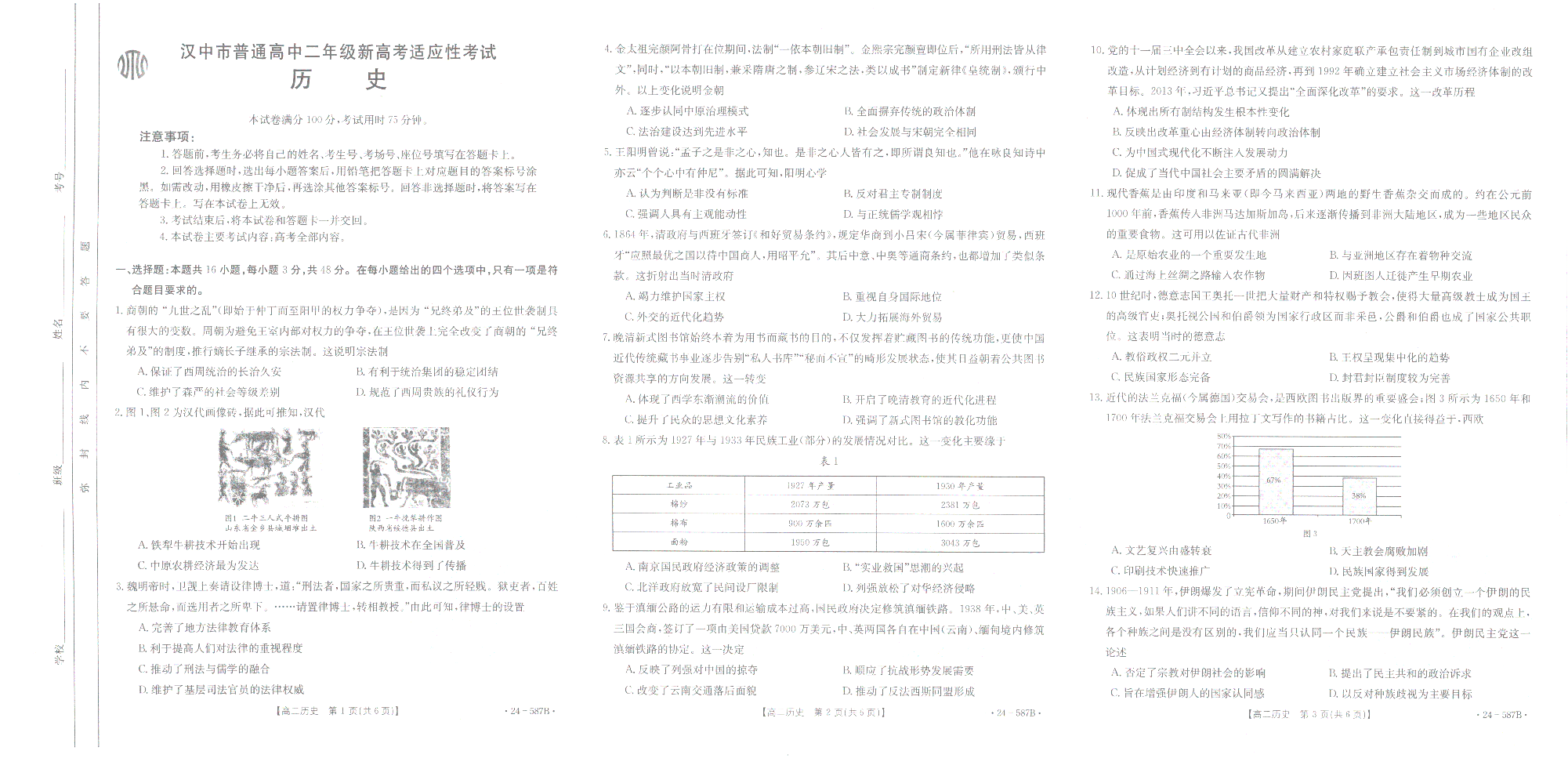 陕西省汉中市高2025届下学期7月期末考试历史+答案