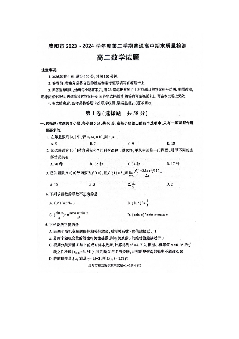 陕西省咸阳市高2025届下学期7月期末考试数学