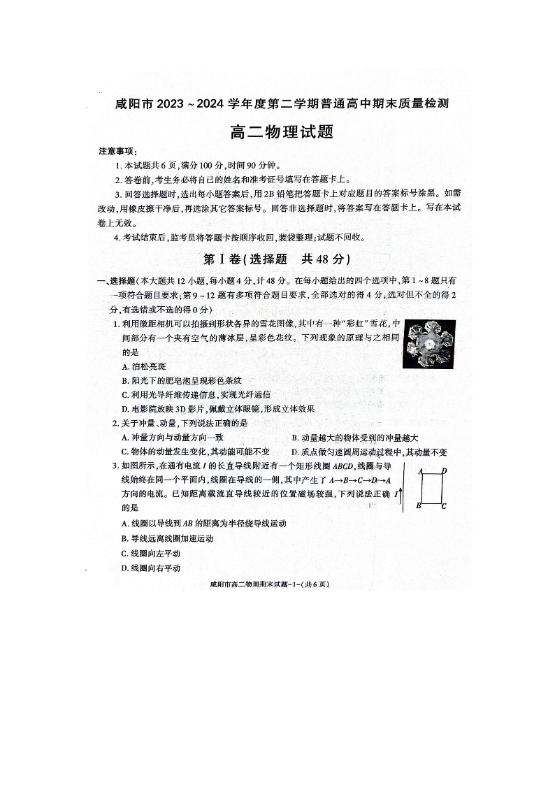 陕西省咸阳市高2025届下学期7月期末考试物理