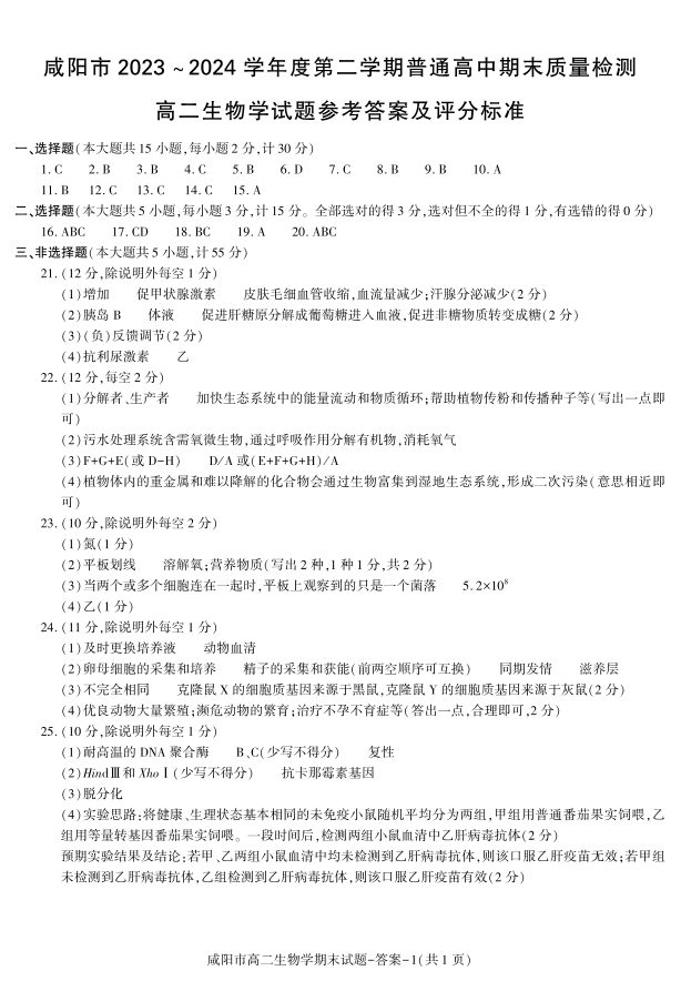 陕西省咸阳市高2025届下学期7月期末考试生物答案