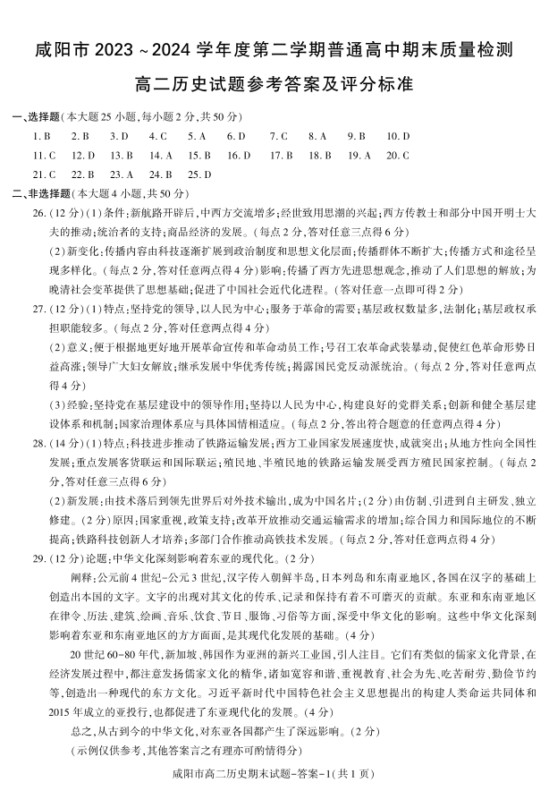 陕西省咸阳市高2025届下学期7月期末考试历史答案