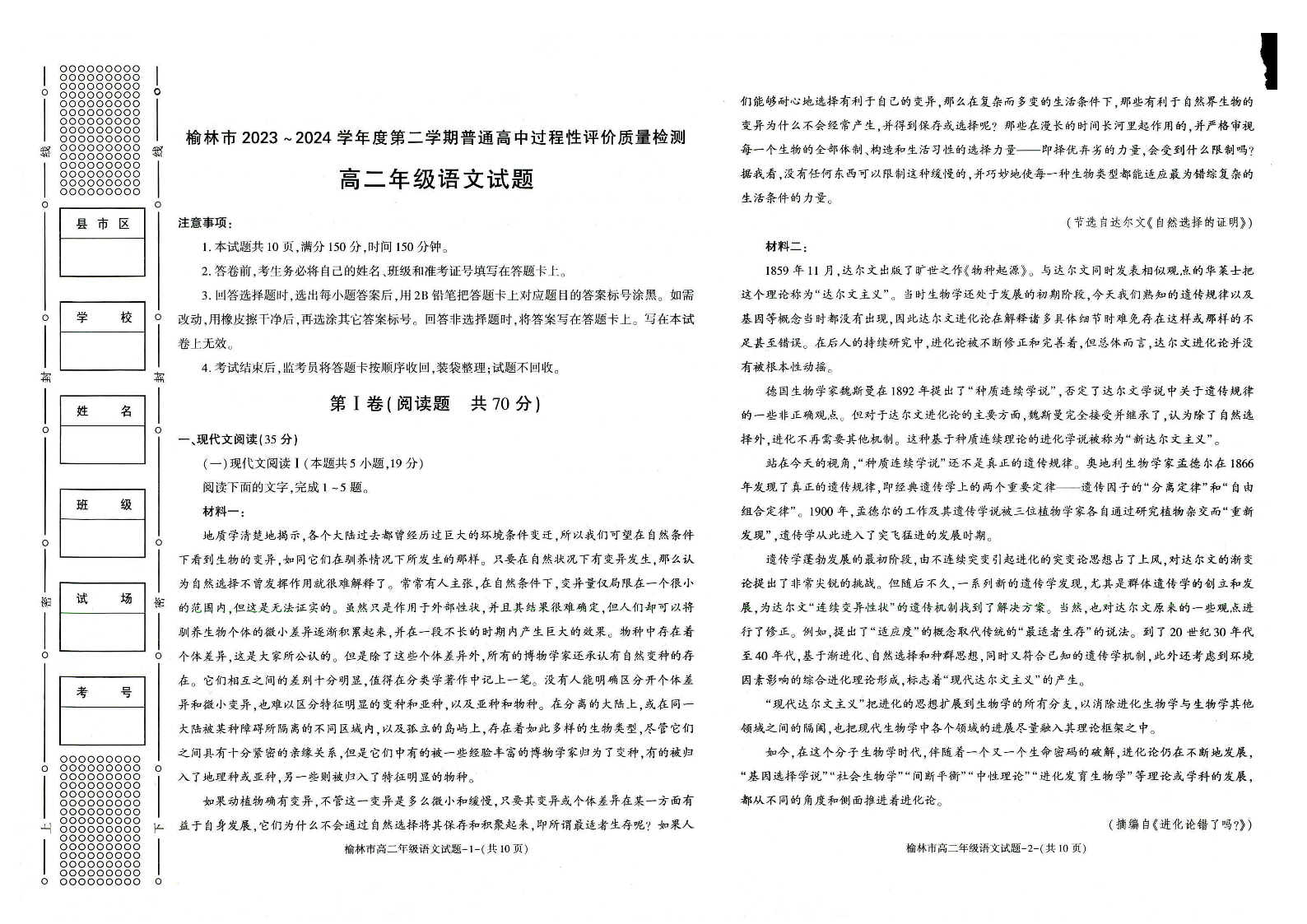 陕西省榆林市高2025届第二学期期末校际联考语文+答案
