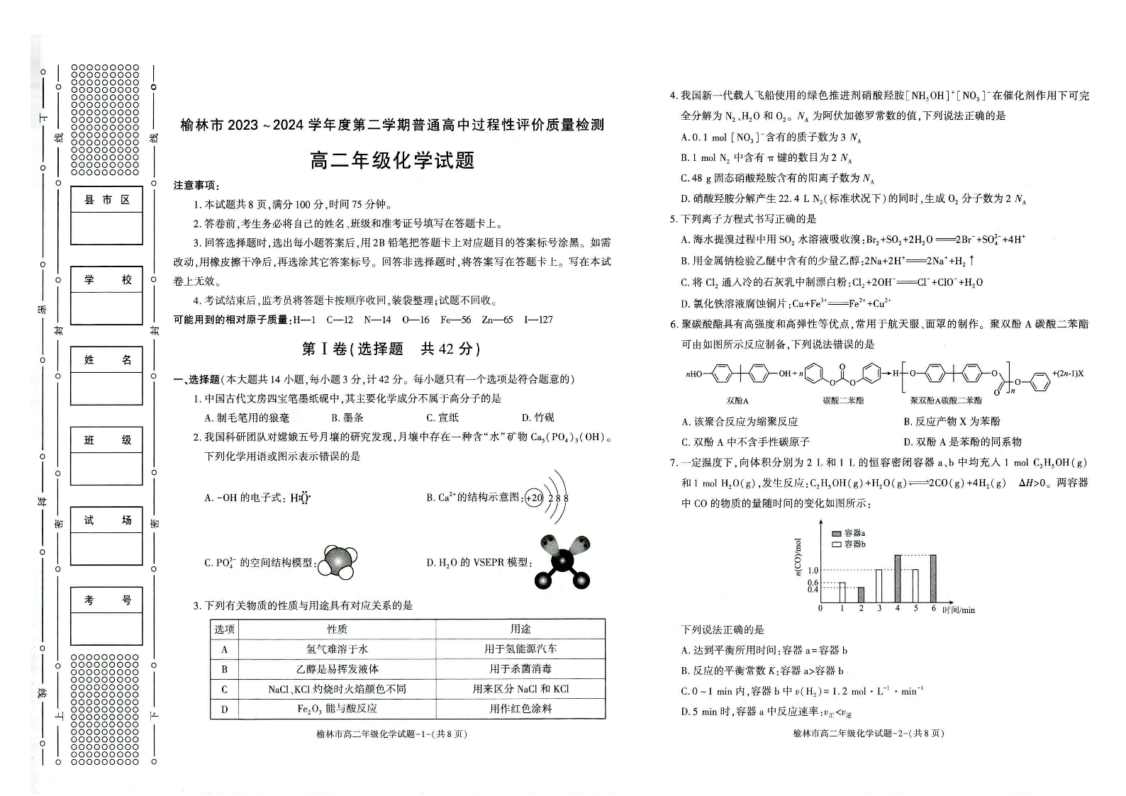 陕西省榆林市高2025届第二学期期末校际联考化学+答案