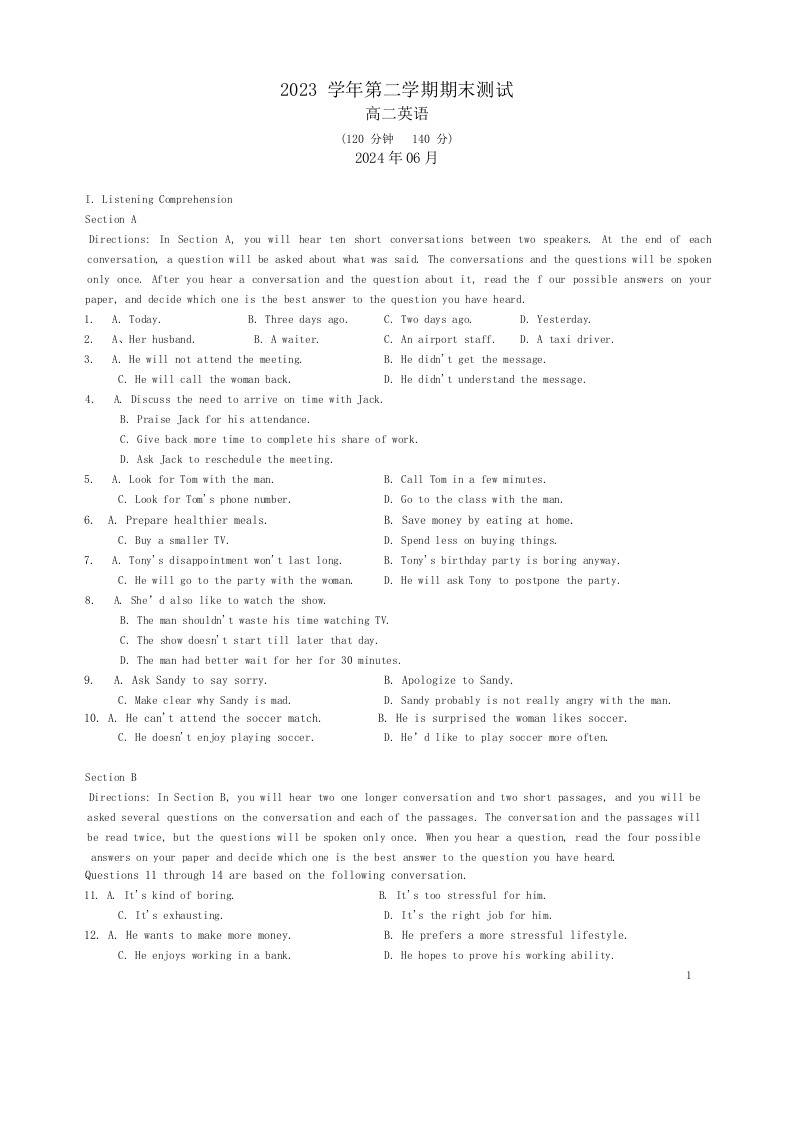 上海市黄浦区敬业中学高二下学期6月期末考试英语+答案