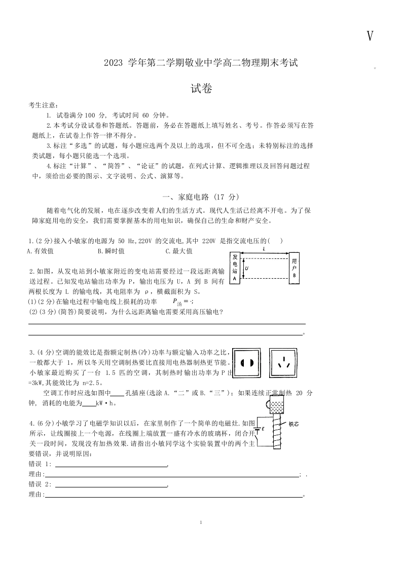 上海市黄浦区敬业中学高二下学期6月期末考试物理+答案