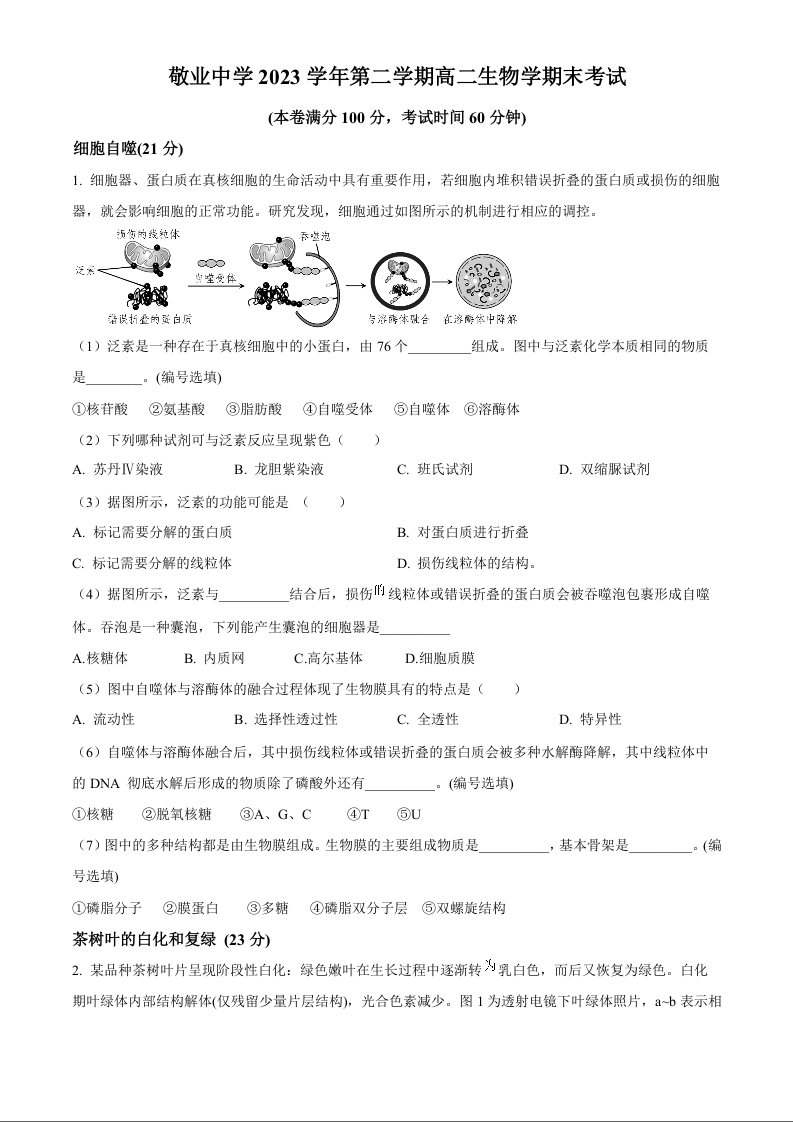 上海市黄浦区敬业中学高二下学期6月期末考试生物+答案