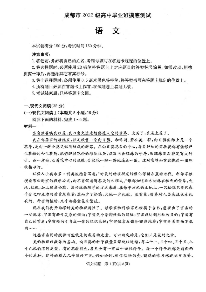 四川省成都市2025届高三零诊(成都市2022级高中毕业班摸底测试)语文