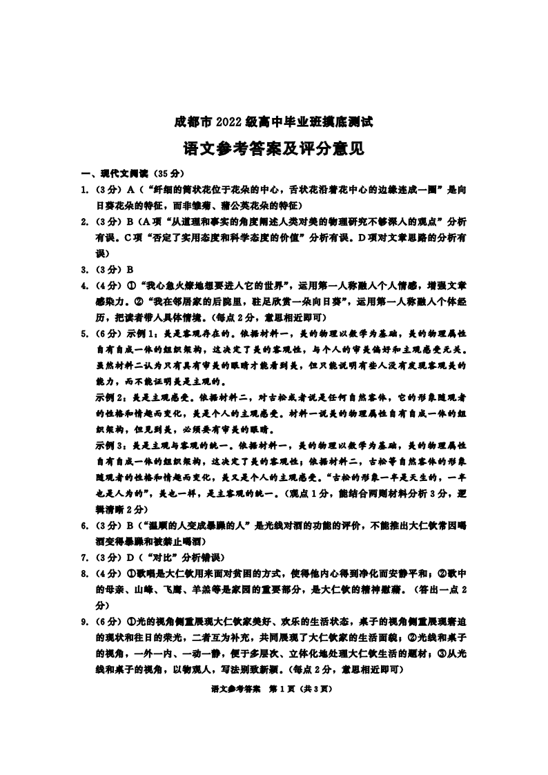 四川省成都市2025届高三零诊(成都市2022级高中毕业班摸底测试)语文答案