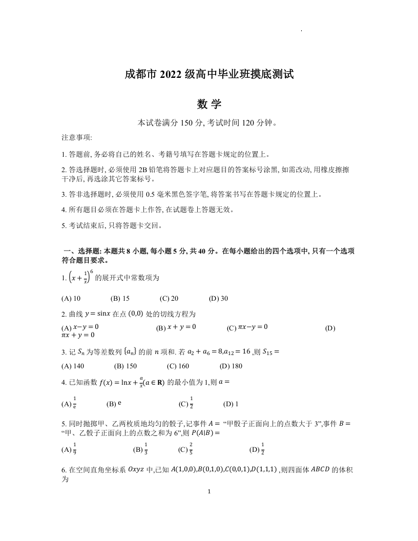 四川省成都市2025届高三零诊(成都市2022级高中毕业班摸底测试)数学