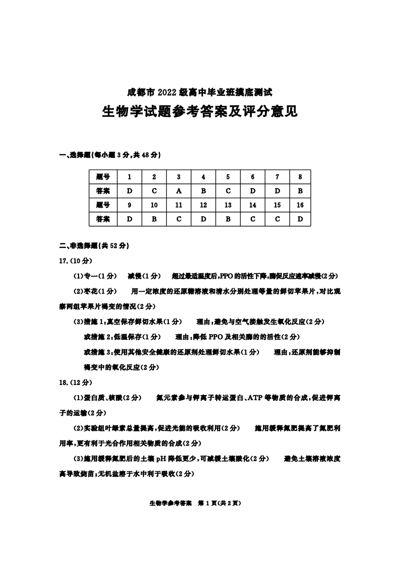 四川省成都市2025届高三零诊(成都市2022级高中毕业班摸底测试)生物答案