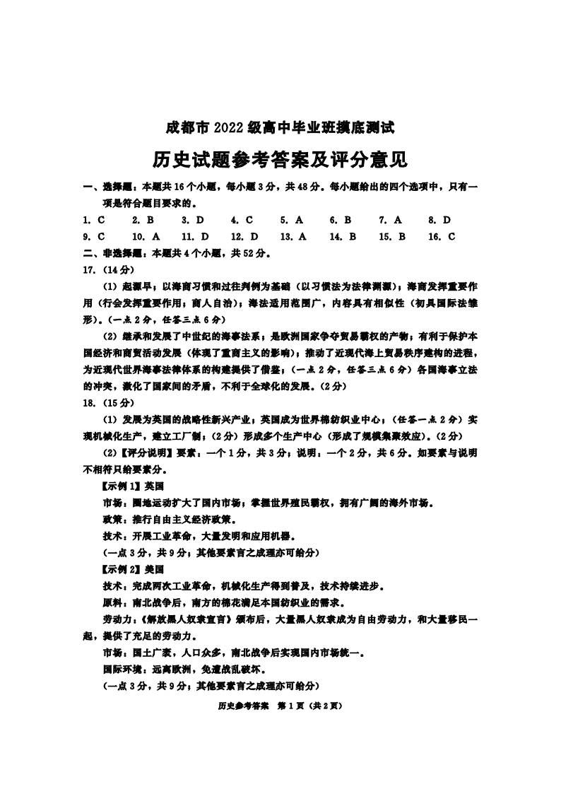四川省成都市2025届高三零诊(成都市2022级高中毕业班摸底测试)历史答案
