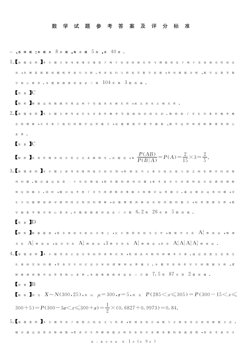 四川省九市高2025届第二学期期期末质量检测联考数学答案